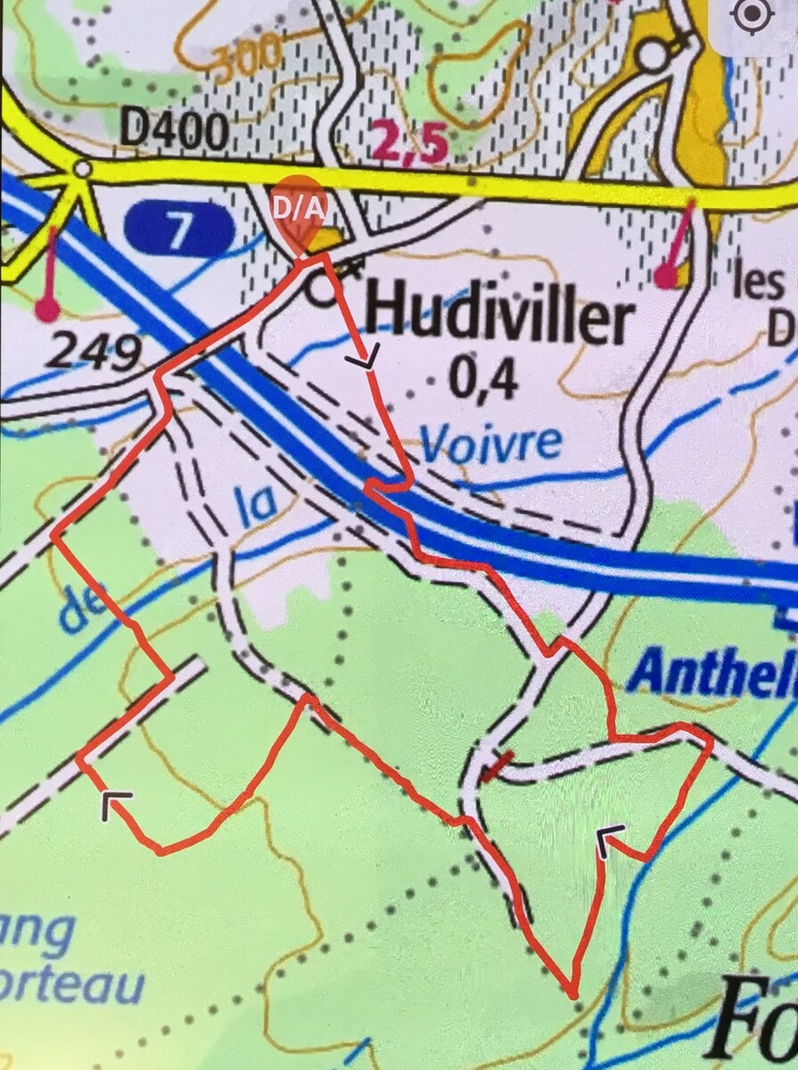 Parcours : direction autoroute - passage sous autoroute - forêt - retour par lieu-dit l'Embanie - passage au-dessus de l'autoroute - arrivée église Hudiviller