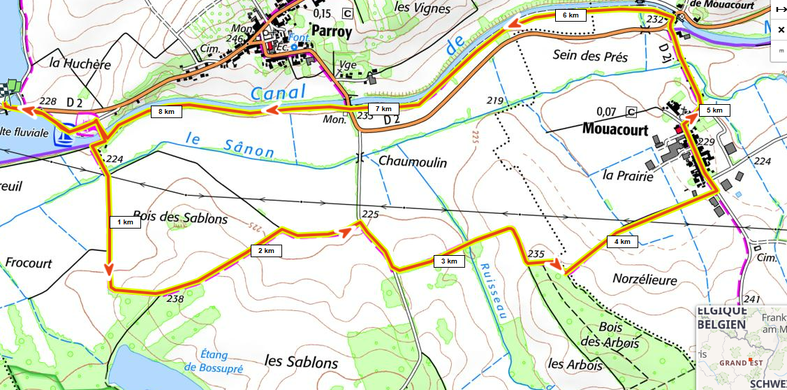 Boucle facile vers Mouacourt et Parroy. dénivelé 75m. retour par la voie verte